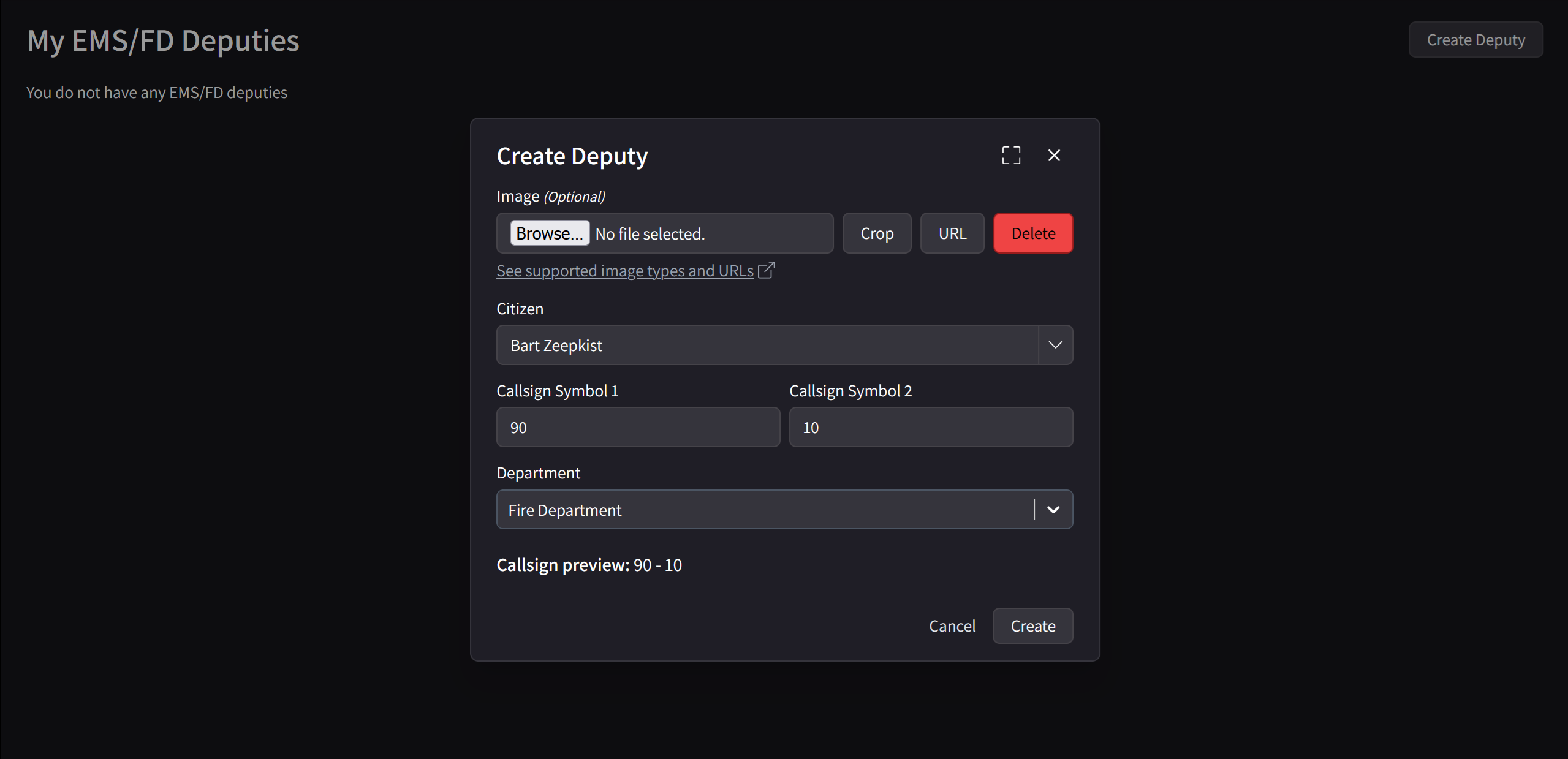 Once you're logged in, you'll want to hit EMS/FD > My Deputies, and then Create Deputy. I've included a screenshot below to show you what you should see.